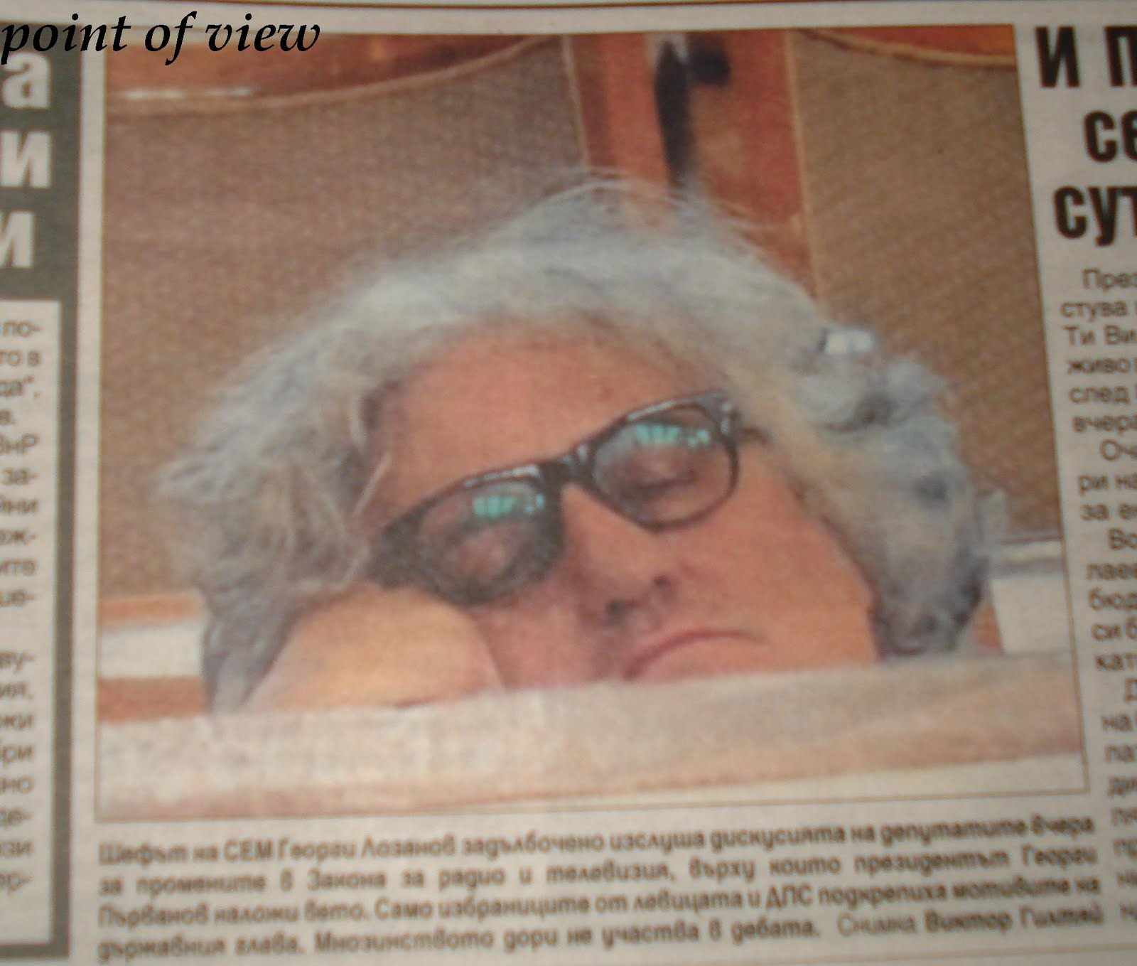 Тъкмо бях решила от днес нататък да прескачам направо на страницата с кръстословицата и судоку, когато попаднах на тази сладурска снимка на Виктор Гилтяй на пета страница. Интересно защо я няма в никъде в нета, та се наложи да я показвам по този допотопен начин. Но пък си заслужава да се види как шефът на СЕМ Георги Лозанов слуша адски задълбочено депутатите. Жалко, че снимките не могат да записват и звуци, за да се насладим и на вероятно мъркащото му похъркване.